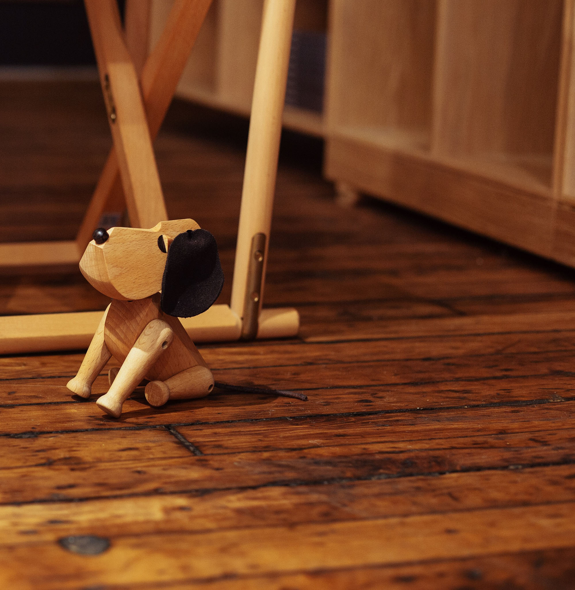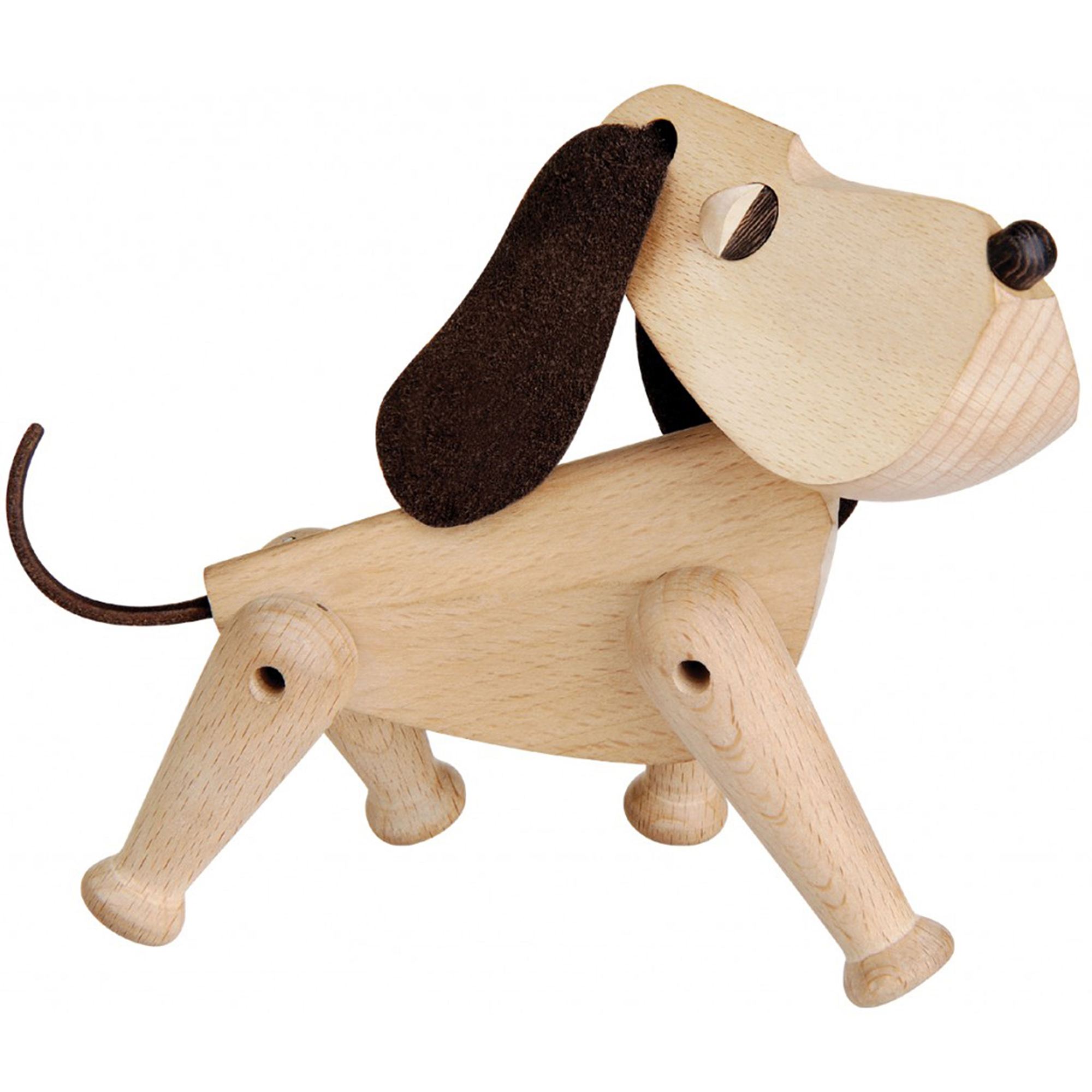 Oscar van Architectmade. Deze handgemaakte hond is vervaardigd van hoogwaardig, natuurlijk beukenhout en is ontworpen door de Deense architect Hans Bølling. Zowel de ledematen als de kop kunnen 360 graden draaien. Hierdoor kan hij zittend, staand, rennend en kruipend gepositioneerd worden. De staart en oren zijn van bruin suède. Leuk als speels accessoire voor op de salontafel, je nachtkastje of in de kinderkamer.