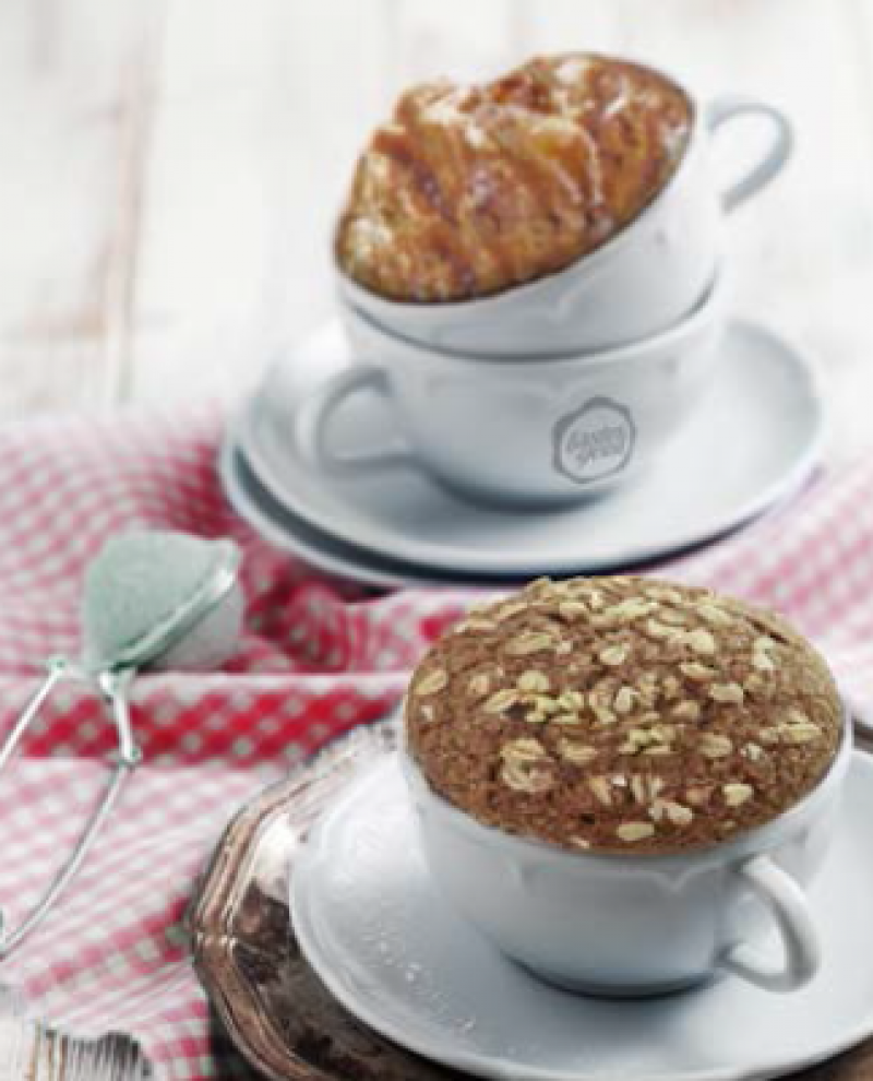 Met deze mixen zet je snel een lekkere havermuffin of een karamelcake op tafel. Gewoon in je eigen mokje even in de magnetron! De havermuffin is ook erg lekker als snel ontbijtje. Tip: serveer er een toefje (kaneel)slagroom bij. Bekijk het filmpje voor de bereiding.