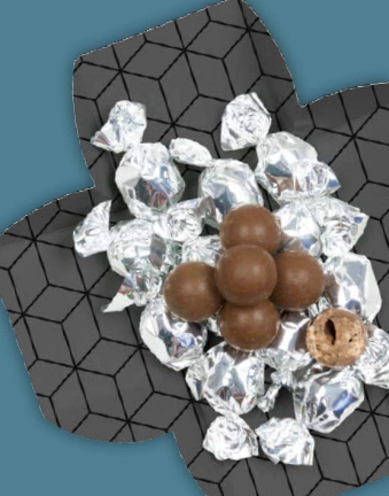 Dit vierkante doosje bevat crunchy chocolade praliné bonbons, verpakt in een feestelijk zilver folietje. Extra leuk: de verpakking is ook een uitdeelschaaltje met een mooie bedrukking aan de binnenzijde. Wel zo feestelijk!